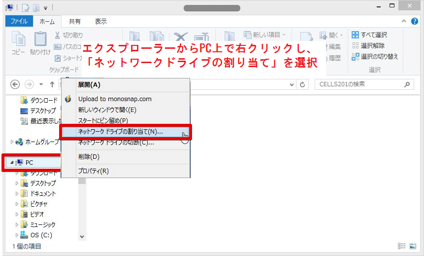 2.ナビゲーションウィンドウの「PC」もしくは「コンピューター」上で右クリックし、「ネットワークドライブの割り当て」を選択します。