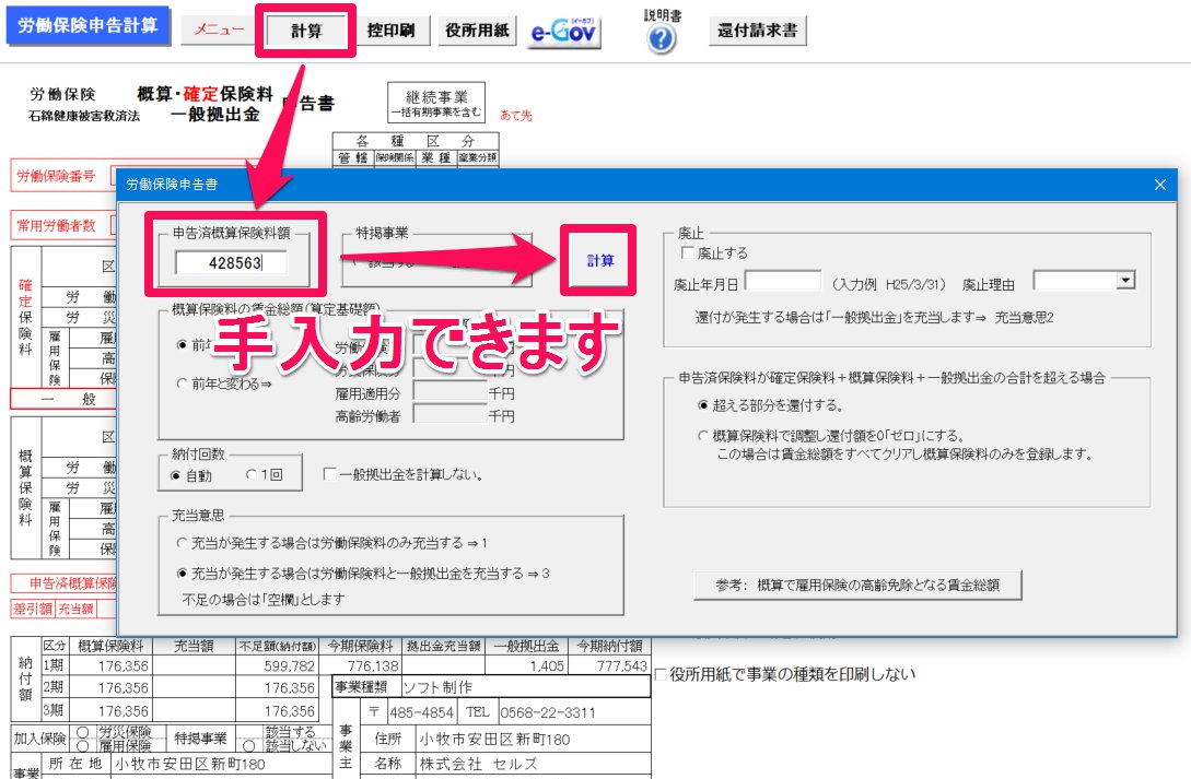 申告済概算保険料額を手入力したいお問い合わせ内容 台帳を使って労働保険の年度更新処理を行います。 昨年は台帳を使っていなかったので、昨年度の申告済概算保険料額が台帳のどこにも登録されていません。もしかして、昨年の年度更新のデータから作らなければいけないのでしょうか。 あるいは、あらかじめどこかで入力することができるなら、その場所を教えてください。 回答 事務組合に委託していない事業所では、会社情報などにあらかじめ登録しておく箇所はありません。 処理ファイル「年度更新」で労働保険料を計算する過程で入力画面が出てきます。 処理ファイル「年度更新」を開きます。 先に確定保険料を算出するために賃金集計表を作成します。「個別」をクリックすると集計表が開きます。 「集計」をクリックして、賃金を集計したい労働保険番号を選択し、「読込」します。 続いて、申告書の作成に入ります。「労働保険申告計算」をクリックします。 「計算」をクリックして表示されたフォーム内に、昨年度の申告済概算保険料額を手入力することができます。 昨年度もこの労働保険番号の年度更新を台帳で行っていればこの額は自動的に挿入されるので、手入力は不要です。 手入力した額が挿入され、その額を踏まえて1期~3期の納付額が計算されます。