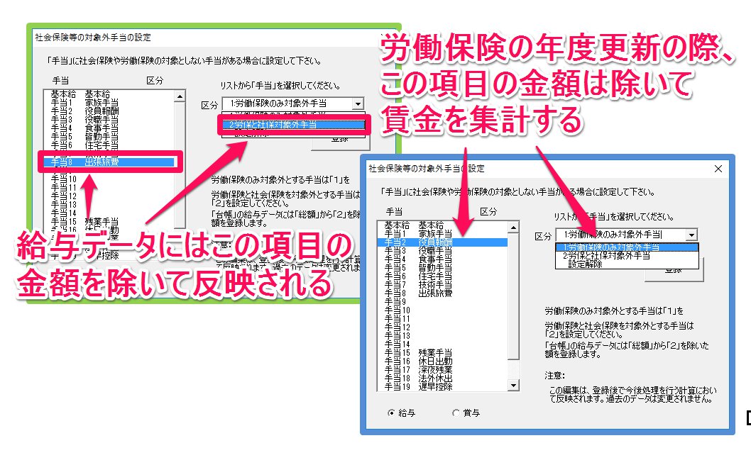 - 「労保と社保対象外手当」の設定をした場合は、給与の総額を台帳の給与データに反映させる際に、その設定した手当項目の金額を除いた額を反映させます。(労働保険や社会保険の報酬には含めない「出張旅費」等を念頭に置いています。)