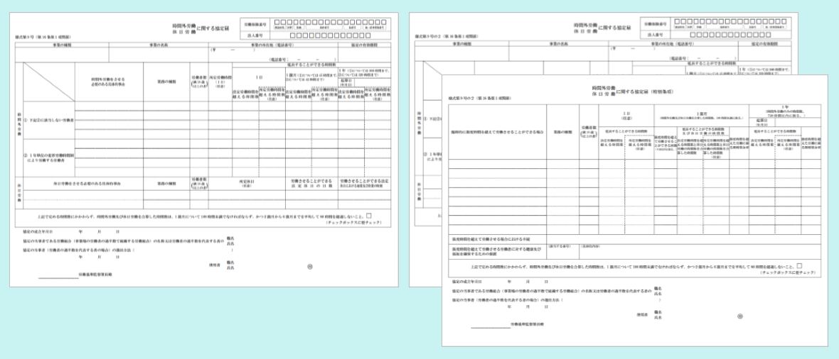 時間外労働の上限規制導入にともない、2019年4月に36協定が変わることを確認しております。なお、中小企業は2020年4月からの施行であり、引き続き旧様式を使用できます(提出先によっては旧様式での届出を指定される場合があります)。