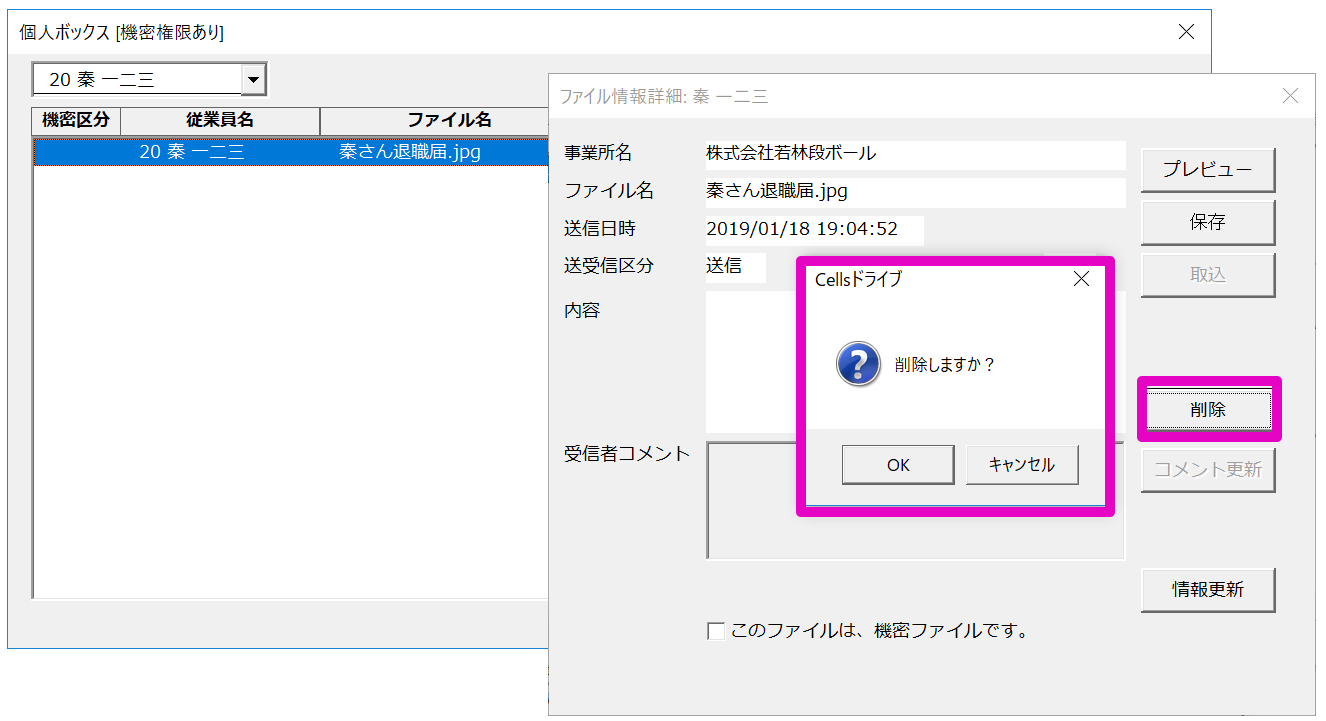 「個人ファイルが残っている」と出て個人情報を削除できないお問い合わせ内容 個人情報を削除しようとしましたが「個人ファイルが残っているため削除できません」というメッセージが表示され、削除できません。 どうしたらよいのでしょうか。 回答 Cellsドライブ上でその従業員に紐づけたデータが残っていると思われます。 そのデータを削除してからでなければ個人情報を削除できない仕様です。 以下の手順で紐づけたデータを削除してみてください。 個人情報フォームの「個人ボックス」をクリックします。 「一度、事業所ファイルを保存します。よろしいですか。」OKします。 従業員利用認証の画面が表示されたらログインします。 この操作の前に何らかの処理のために既にログインしている場合は表示されません。 次の手順へお進みください。 データを削除したい人を探してクリックします。 その人に紐づけられているデータが表示されますので、Wクリックします。 そのデータの詳細が表示されたら「削除」をクリックして削除します。