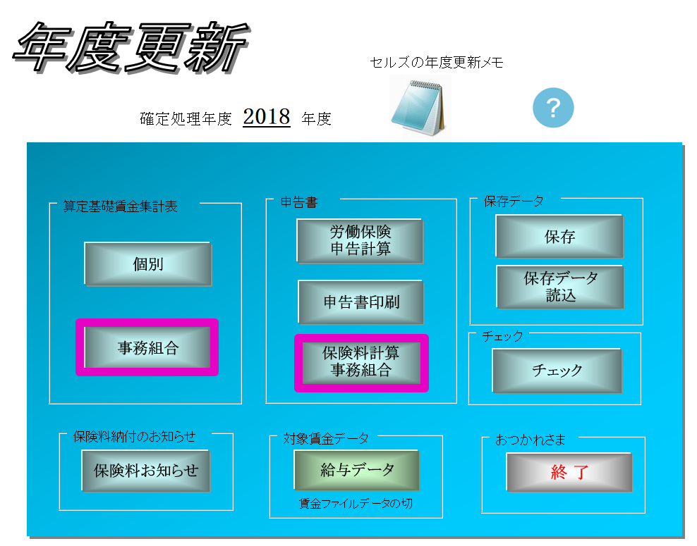 処理ファイル「年度更新」内の「事務組合」「保険料計算事務組合」の2機能