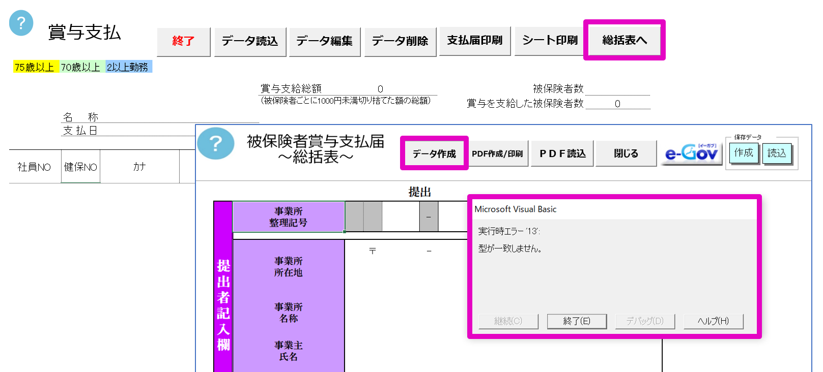 また、賞与支払届総括表の「データ読込」も同じく「型が一致しません」というエラーになります。