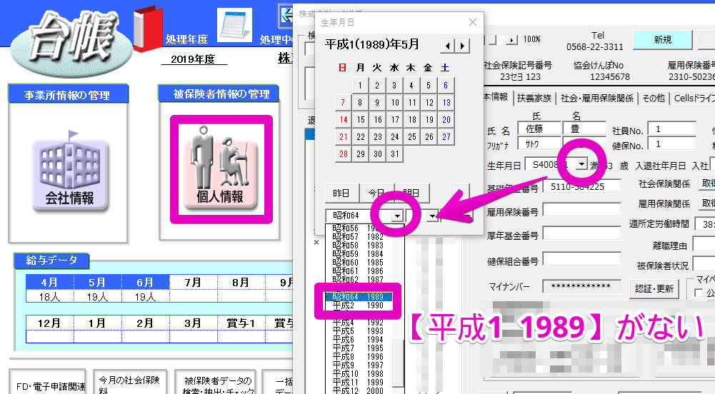 「台帳」個人情報の生年月日等にある年表示プルダウンに「令和1年」がない
