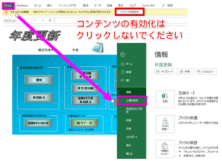 ※「上書き保存」をクリックした後で「このファイルは保存できません。」と表示される場合は「OK」をクリックし、年度更新の画面を右上の「×」ボタンで閉じます。次に、「年度更新.xls」のExcelファイルをコピーし、一旦デスクトップに保存してから、手順4の操作をおこなってください。手順4の後、「年度更新.xls」のExcelファイルを、手順2の、「DaProcess」のフォルダに保存します(この時「ファイルを置き換える」を選択してください)。この後、台帳を通常通り起動し、年度更新の処理ファイルを起動していただき、エラーが解消されたかどうかをご確認ください。上記の操作でエラーが解消できなかった場合は、【Excelの信頼できる場所の設定】もお試しください。