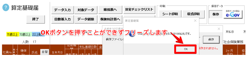 算定基礎届を作成し、保存データを作成しようとすると、OKボタンが押せずパソコンが固まります。解消方法はありますか?