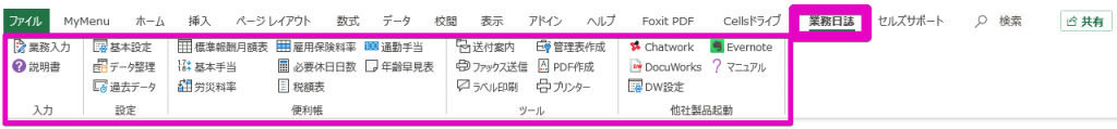 「アドイン」タブ→「セルズMENU」にご用意していた各機能のうち、台帳内に重複していた機能について、台帳Ver.10.00.09にてレイアウト変更をいたしました。