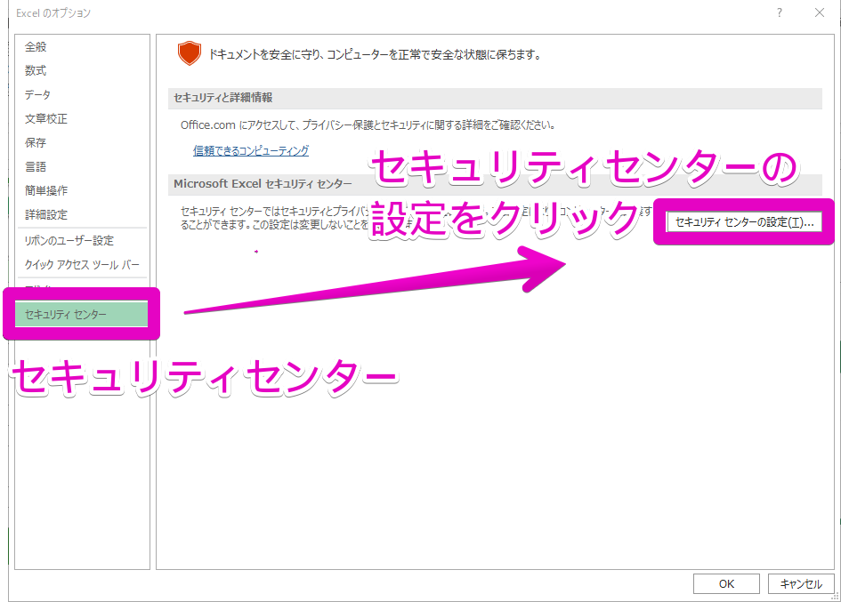 - 「セキュリティセンター」⇒「セキュリティセンターの設定」をクリックします。