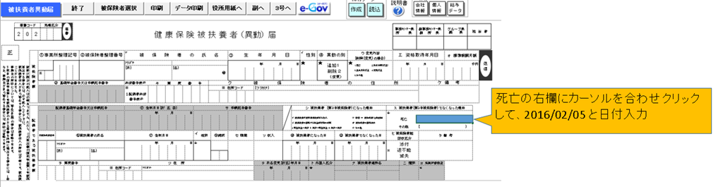 健康保険被扶養者(異動)届死亡の電子申請「亡くなった理由」欄に、明治33年01月00日と入るお問い合わせ 健康保険被扶養者(異動)届死亡の場合、電子申請で「亡くなった理由」欄に、明治33年01月00日と入るのですがどうしてでしょうか? 回答 「ス 被扶養者(第3号被保険者)でなくなった理由」の「死亡」の右側にカーソルが合わせられるので、セルを選択し「2016/02/05」というように直接日時を入力していただきますようお願いいたします。