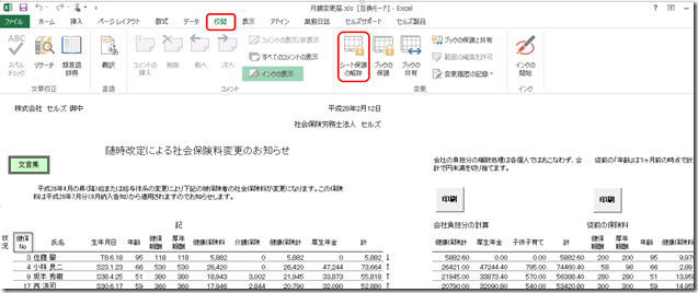 任意の処理ファイルのPDF保存お問い合わせ 台帳⇒ 月額変更届⇒ 通知書(会社用および個人用)をPDF保存することはできますか? 回答 処理ファイルにPDF化するボタンがない場合は、 ①「校閲」⇒ 「シートの保護解除」 ② 「ページレイアウト」タブから「印刷範囲」の選択 ③台帳メニューバーの「業務日誌」にある「PDF作成」を選択でPDF保存してください。