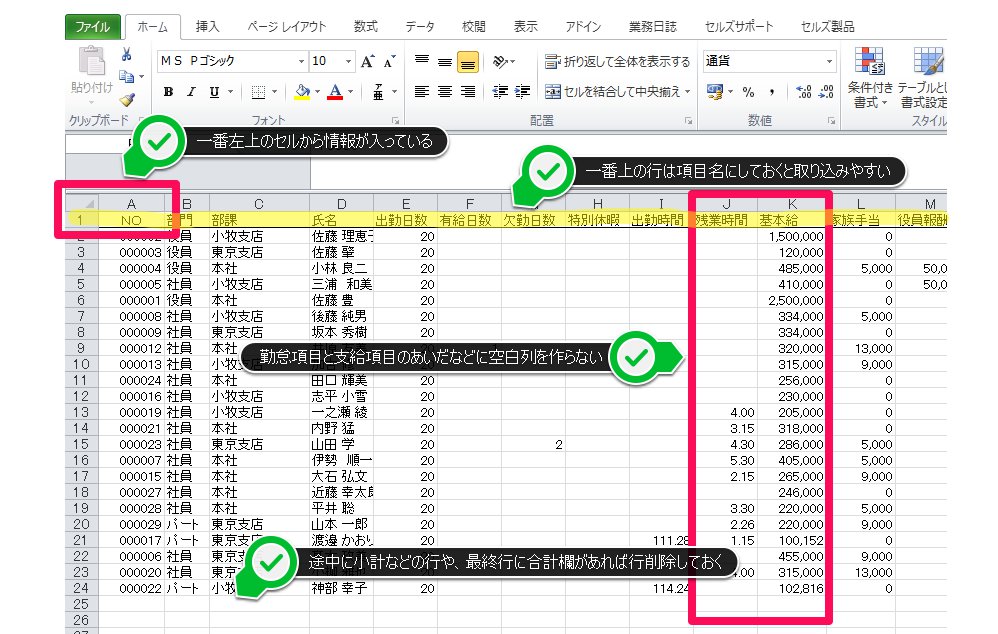 また、賃金ファイルに取り込むためには最低限7つの項目が必要です。