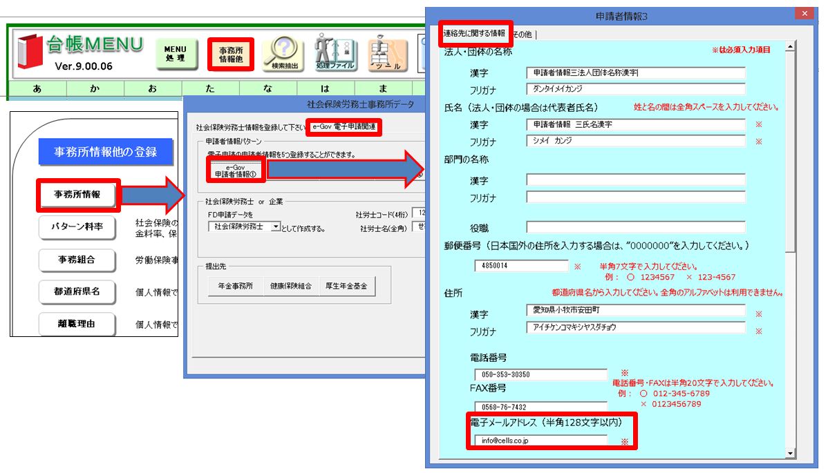 e-Govから受信するメールのアドレスを変更したい(電子申請)お問い合わせ 「電子申請」終了後に届く「形式チェック終了のお知らせ」と「状況通知メール」の受信先のアドレスを変更したいのですが。 回答 下記2点のメールアドレスを変更してください。 ①「台帳MENU」の「事務所情報他」の「e-Gov申請者情報」の「連絡先に関する情報」の「電子メールアドレス」を変更 ②パーソナライズ画面にログインし、「メールアドレス変更」を変更
