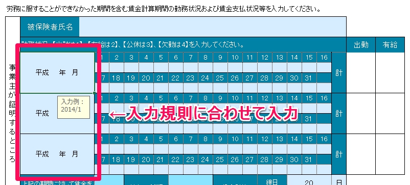 • 「事業主が証明するところ」の勤務状況の年月を入力規則(例:2014/1)とは異なる形式で入力している場合