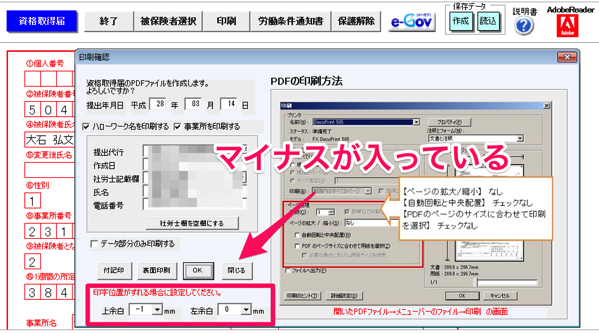 雇用保険取得届の印刷画面でPDFに変換しようとすると「アプリケーションのコンポーネントでハンドルされていない例外が発生しました」と表示され、印刷ができません。