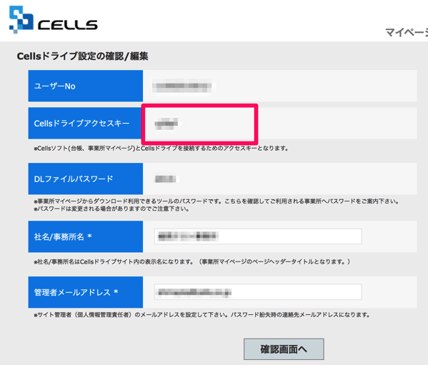 Cellsドライブ設定で入力するCellsドライブアクセスキーはどこで確認できますか?