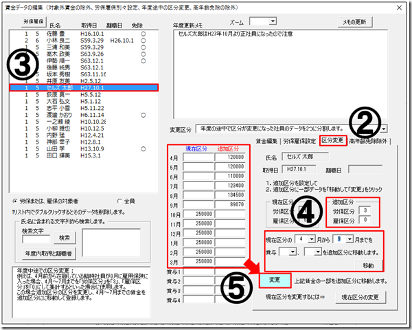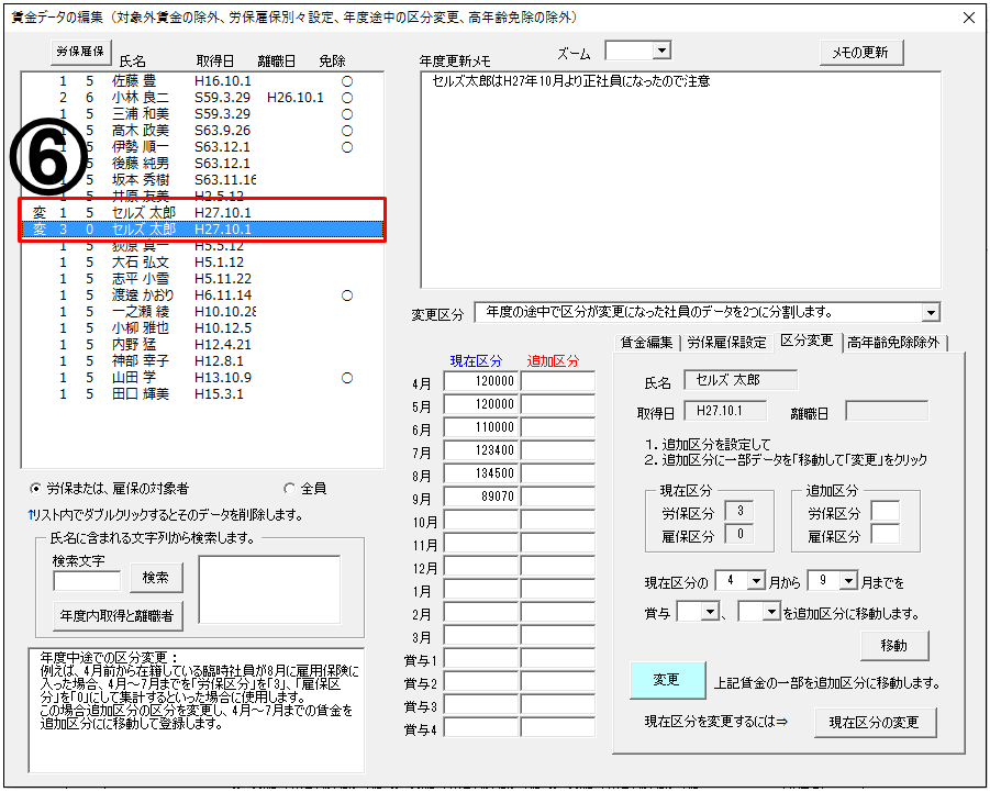 年の途中でパートから正社員雇用された人がいます。年度更新のために給与データを分ける必要があります。現在、個人情報では社員の区分で登録されていますがどのようにしたらいいでしょうか。