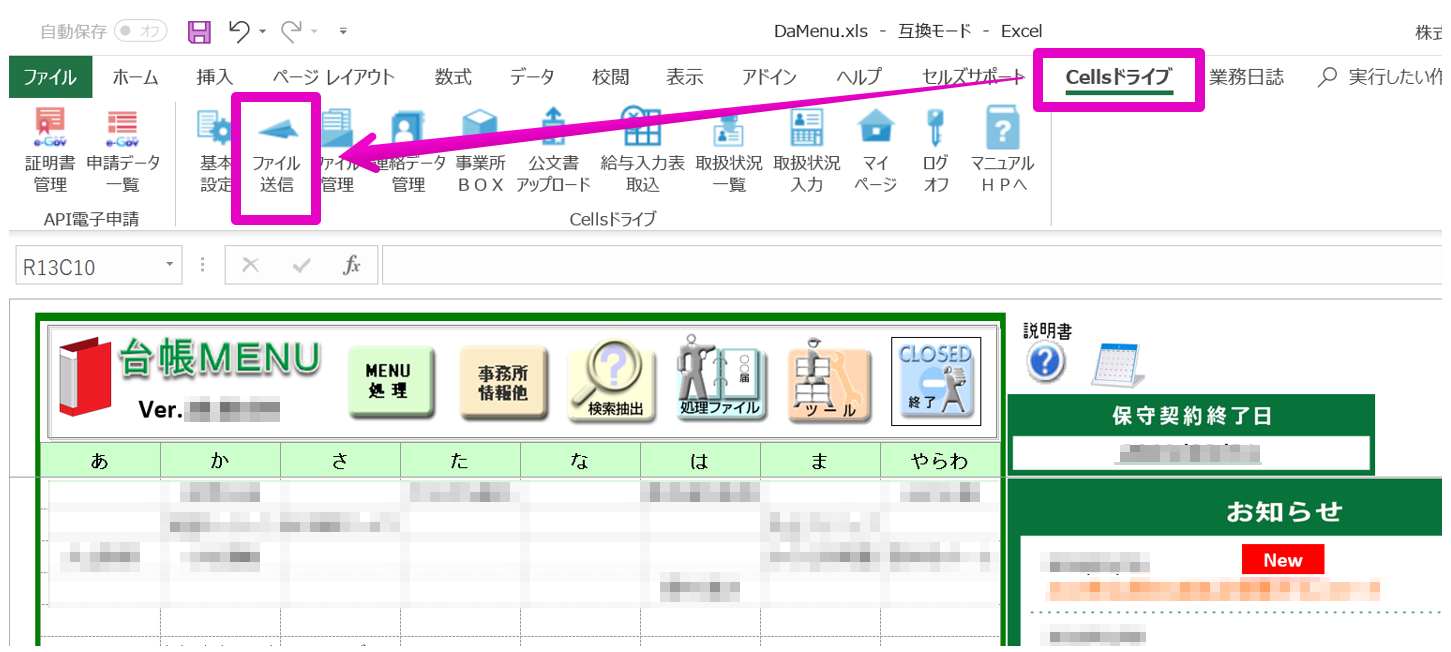 CellsドライブCellsドライブの登録がある事業所名を変更したいお問い合わせ内容 Cellsドライブも登録している顧問先の会社名を変更したいのですが、どのように変更すればいいでしょうか。 回答 台帳MENU画面の「MENU処理」を開きます。 名称変更したい事業所の...